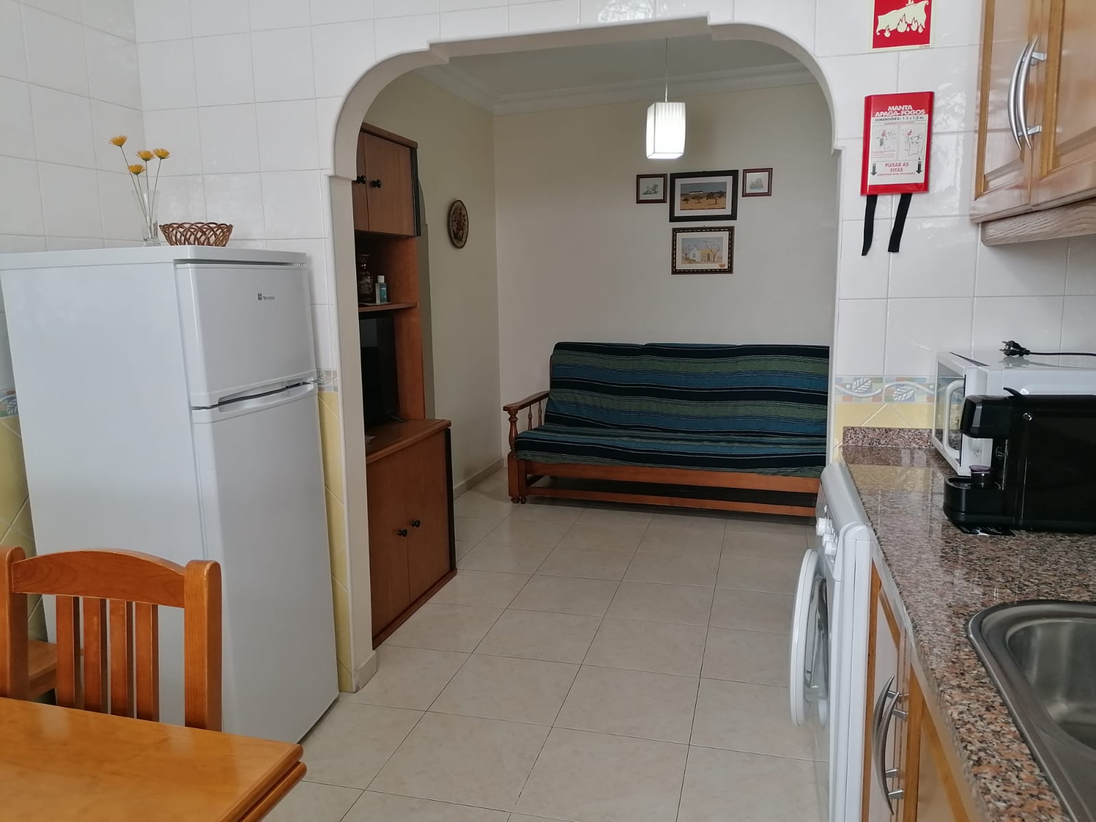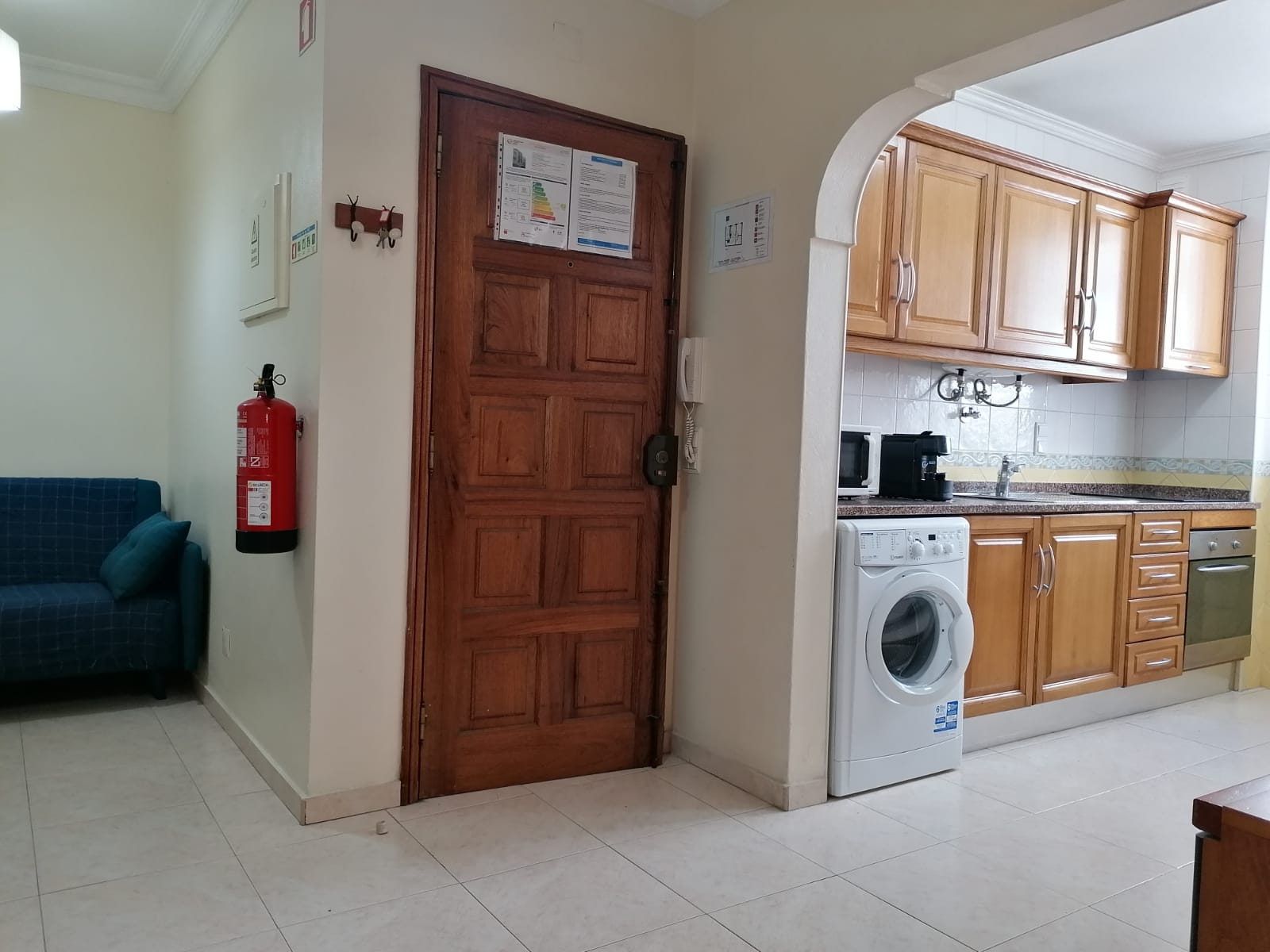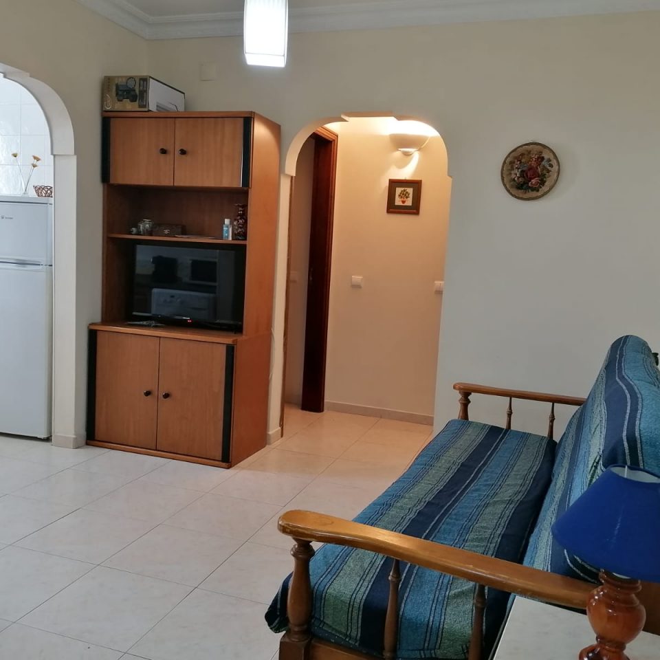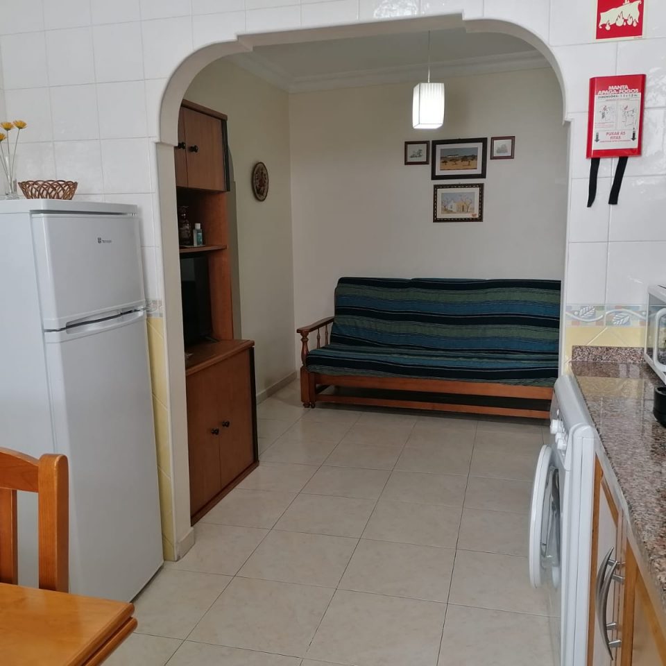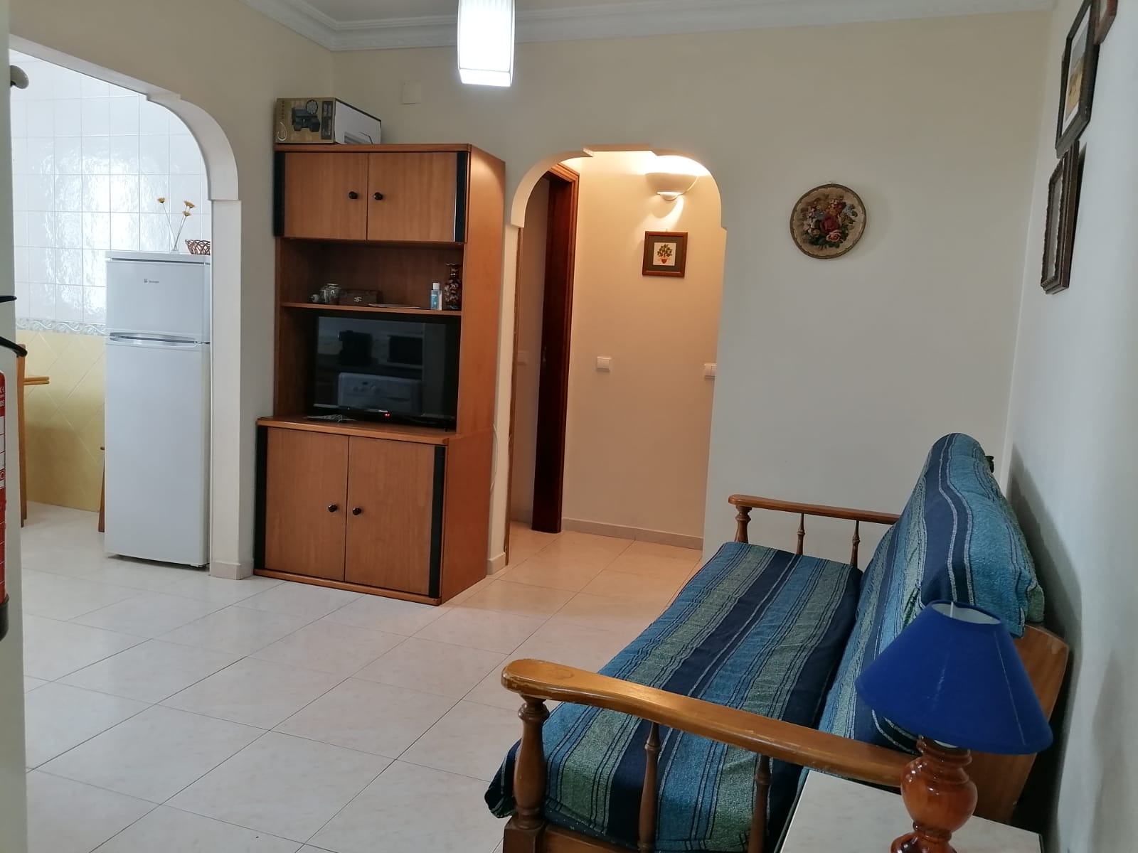 Apartamento T1 a 350 metros da praia de Monte Gordo, composto por um quarto, uma casa de banho com banheira e sala/cozinha.